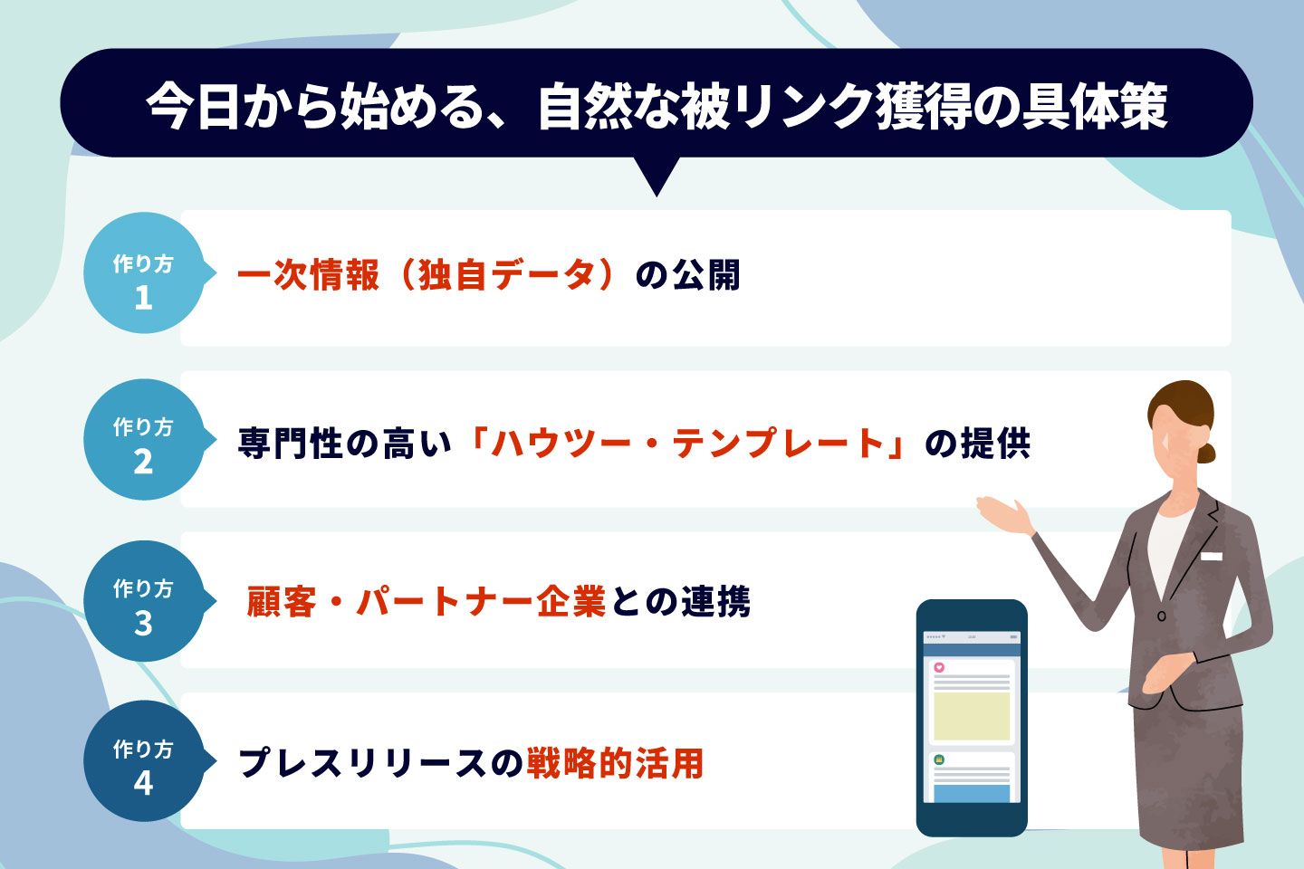 自社で実施したアンケート結果や業界の統計データは、非常に強力なリンクベイト(リンクを引き寄せるコンテンツ)になります。他のメディアが記事を書く際に「〇〇社の調査によると……」と引用されやすいためです。グラフや図解を添えて、引用しやすい形で公開しましょう。